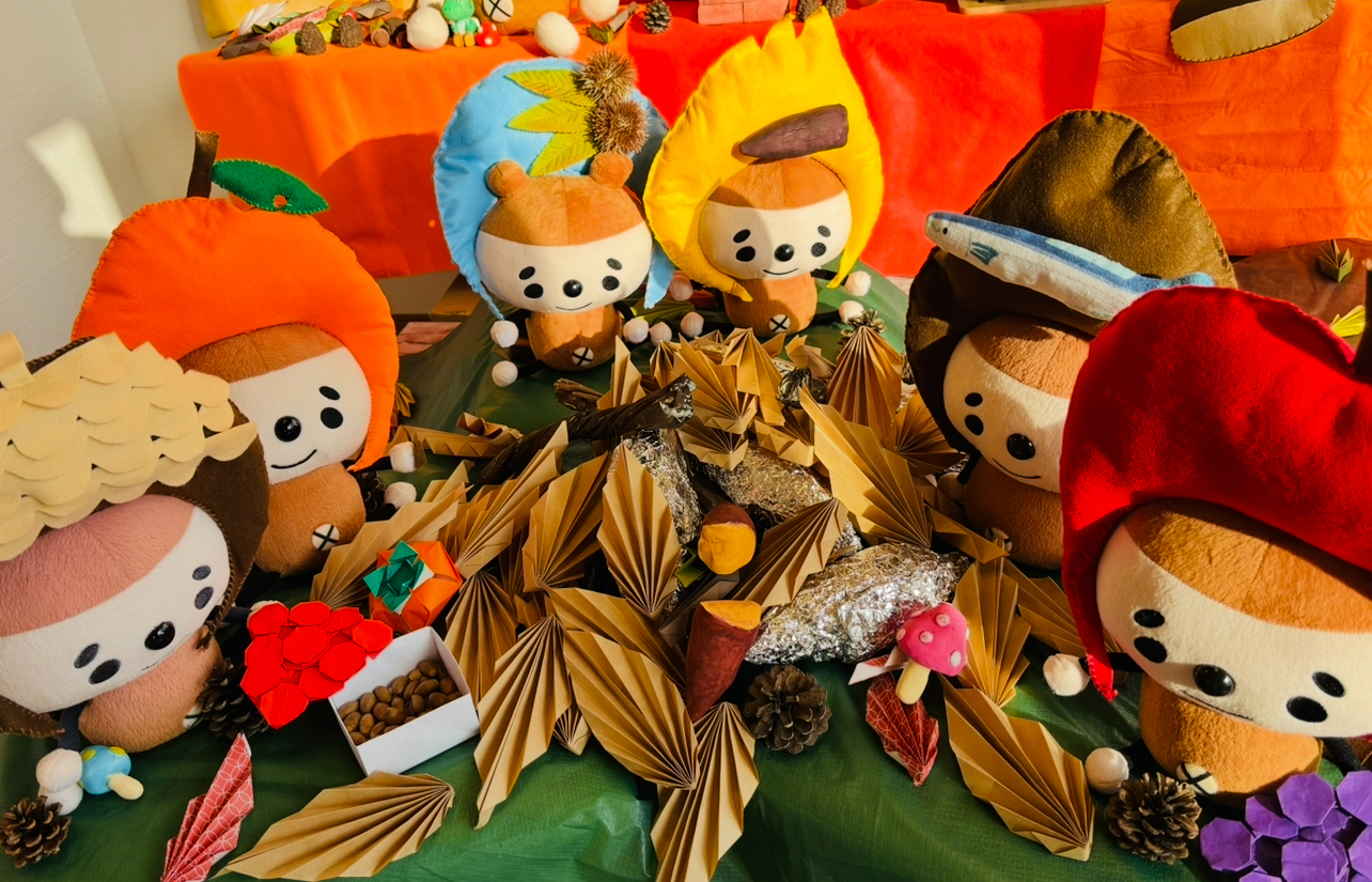 子ぽんぽん達は秋らしい被り物で、焚き火を囲んで焼き芋が出来るのを待っています…😌🍽️